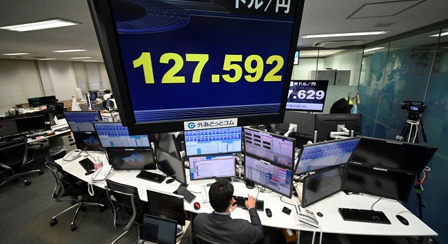 Pedestrians look at electronic sign boards showing the Japanese yen’s rate against the US Dollar (L) and the closing numbers of the Tokyo Stocks Exchange (R), along a street in downtown Tokyo on January 18, 2023. (Photo by Kazuhiro NOGI / AFP)