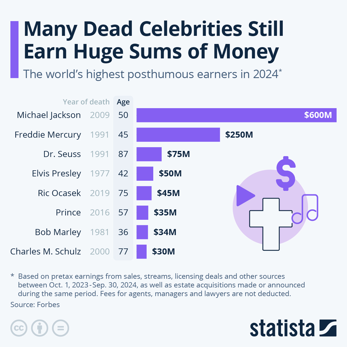 Our annual list of the top-earning dead celebrities measures pretax income from October 1, 2019 through October 1, 2020. We compile our numbers with the help of data from MRC Data, IMDbPro, NPD BookScan and interviews with industry insiders. Fees for agents, managers and lawyers are not deducted.