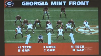 When you watch defensive line prospects, yes the production matters but I also think how they move and get from point A to point B is a big point in filling out a scouting report. With Stewart, it’s important to understand what he was asked to do and why he was asked to do it (this also applies to Georgia EDGE Mykel Williams in a way, but even those two guys are different). Under first-year HC Mike Elko at Texas A&M, the Aggies ran the tite/mint front defenses that have taken over college football, and are similar to what Georgia has run in their latest stretch of dominance. In these defenses, the defensive line is taught much differently than other defensive line play. The structure of the defense calls for players like Stewart to be placed as the 4i technique on the line, rarely having many reps out wide where he can pin his ears back. This is a screenshot from a clinic Kirby Smart and Glenn Schumann talked at (which I highly recommend watching), and it shows that instead of lining up in a traditional four-man front, with a 3-technique and 1-technique defensive tackle and two edge players, Georgia slides one of those edge types inside to a 4i. This creates an even front box count with odd front spacing, hopefully funneling everything outside to the speed.
