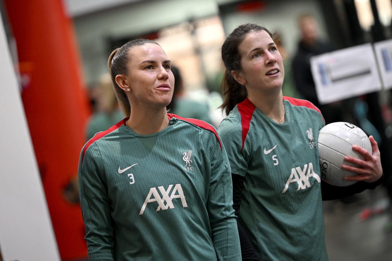 Gemma Evans and Niamh Fahey of Liverpool during a training session at AXA Melwood Training Centre on February 07, 2025 in Liverpool, England. | Photo by Nick Taylor/Liverpool FC/Liverpool FC via Getty Images