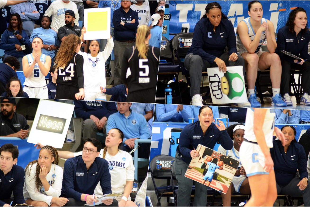 And then some folks couldn’t stop looking at Columbia’s bench, where players and coaches for the Lions took turns hoisting cardboard signs in the air, slapping them and waving them, to signal different things to the players on the floor. One had the word “NEON” written on it. Another featured a green mushroom from the Super Mario Bros. video games. And a third showed a Columbia player flexing.