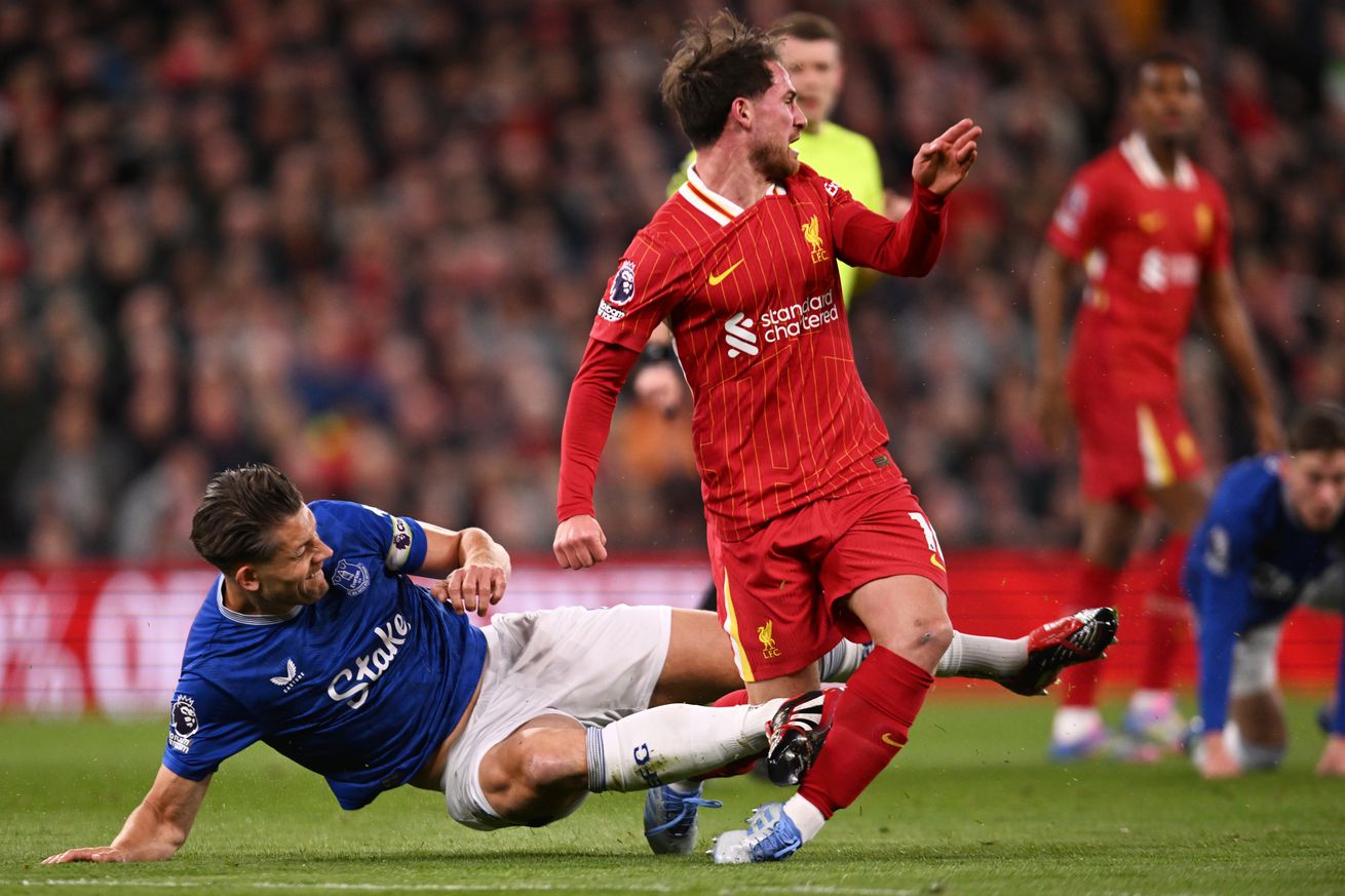 The Everton player went studs-up with force into the leg of Liverpool’s Alexis Mac Allister but only saw yellow and VAR chose not to intervene.