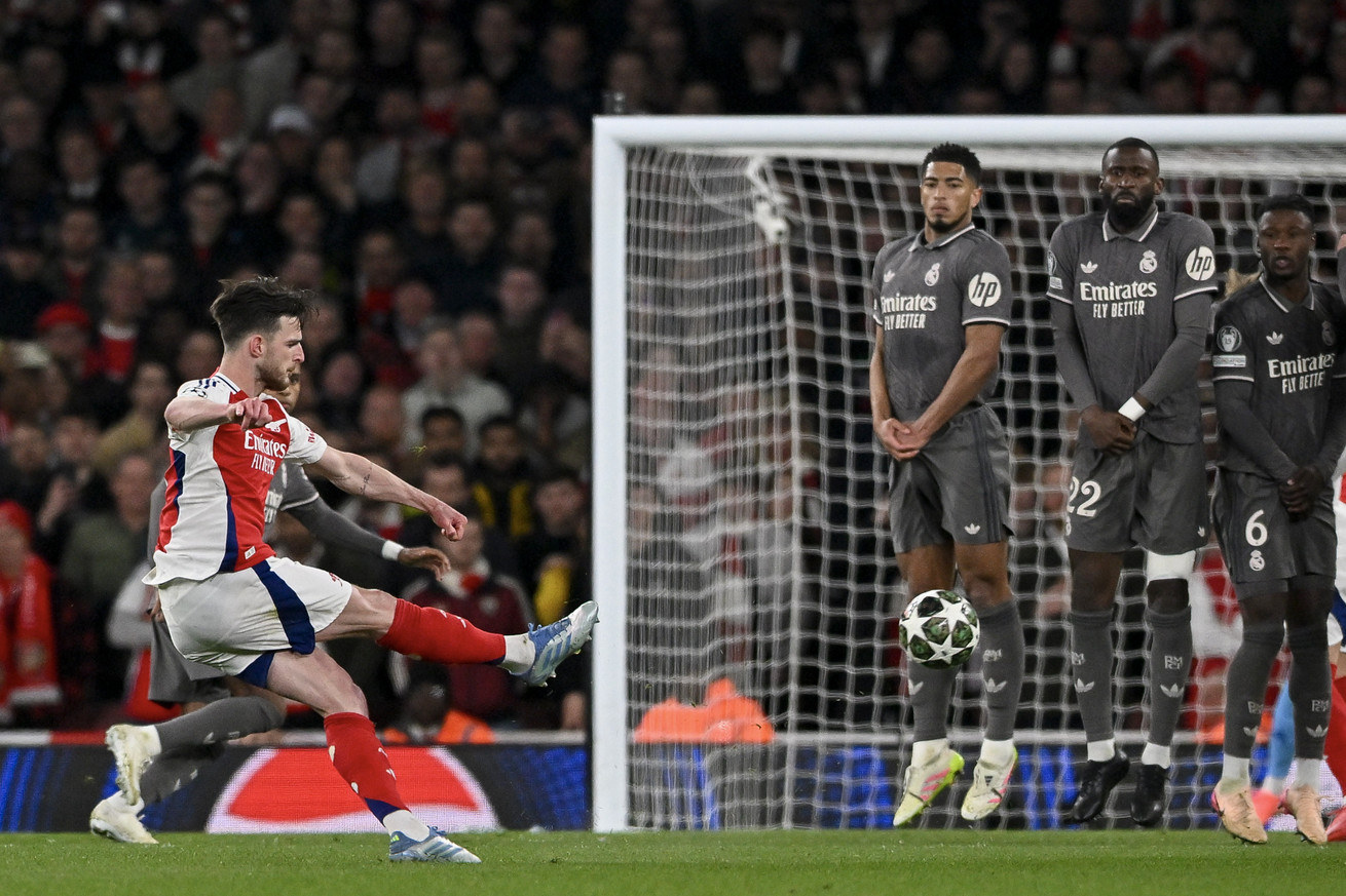 The first came after Bukayo Saka drew a foul from David Alaba in the 57th minute. Rice then stood over the ball before bending in an incredible shot around the wall as well as the post, just out of reach of Real Madrid keeper Thibaut Courtois: