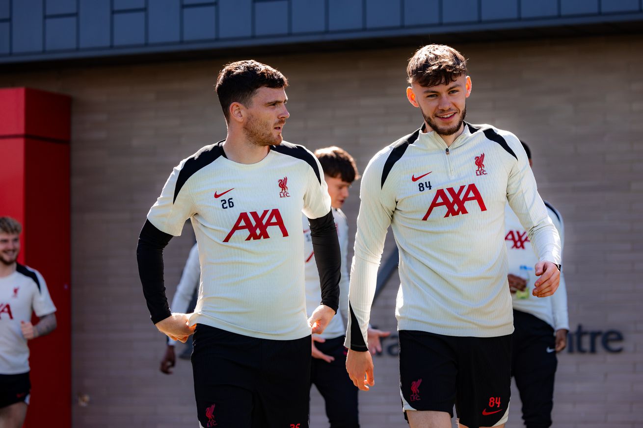Andy Robertson and Conor Bradley of Liverpool during a training session at AXA Training Centre on April 09, 2025 in Kirkby, England. | Photo by Nikki Dyer – LFC/Liverpool FC via Getty Images