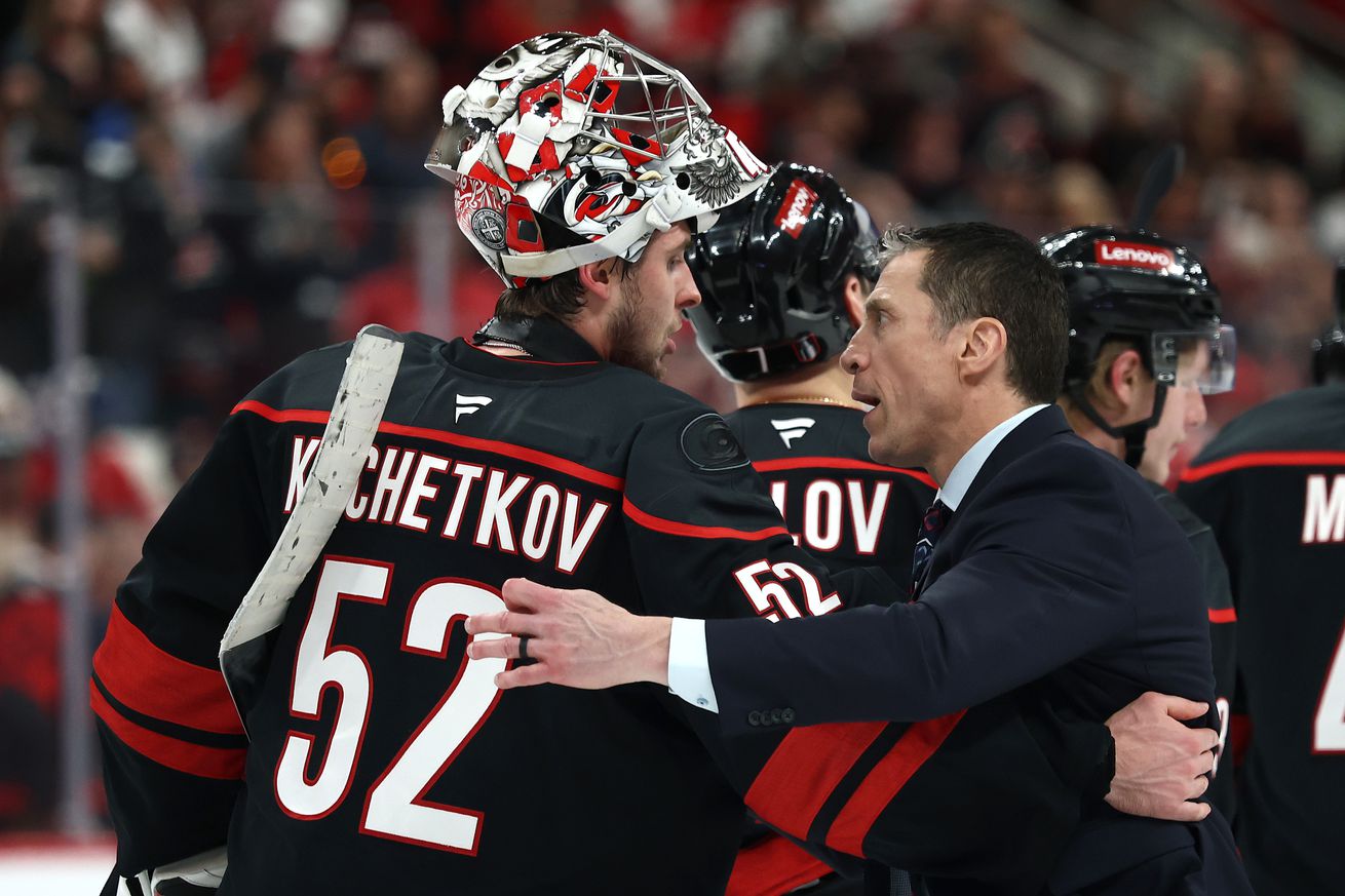 Pyotr Kochetkov #52 and head coach Rod Brind’amour of the Carolina Hurricanes hug after their 5-4 series clinching double overtime win against the New Jersey Devils in Game Five of the First Round of the 2025 Stanley Cup Playoffs at Lenovo Center on April 29, 2025 in Raleigh, North Carolina.