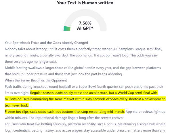 Peak traffic during knockout-round football or a Super Bowl fourth quarter can push platforms past their limits overnight. Regular-season loads barely stress the architecture, but a World Cup semi-final with millions of users hammering the same market within sixty seconds exposes every shortcut a development team ever took.